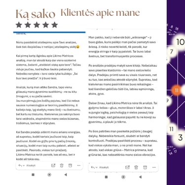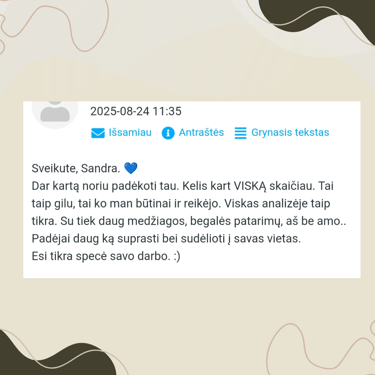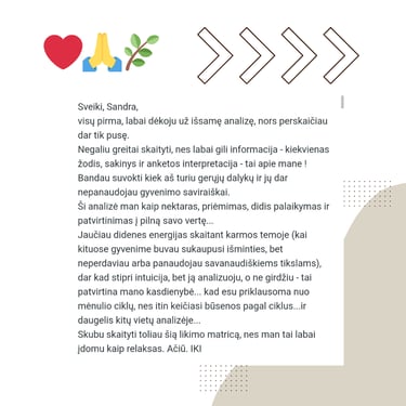 Jūsų žodžiai ne tik papildo Likimo Matricos analizės procesą, bet ir suteikia man sparnus eiti toliau, kurti dar giliau ir jautriau.