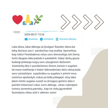 Kiekviena Jūsų žinutė, patirtis ar pasidalintas jausmas man yra neįkainojama dovana.